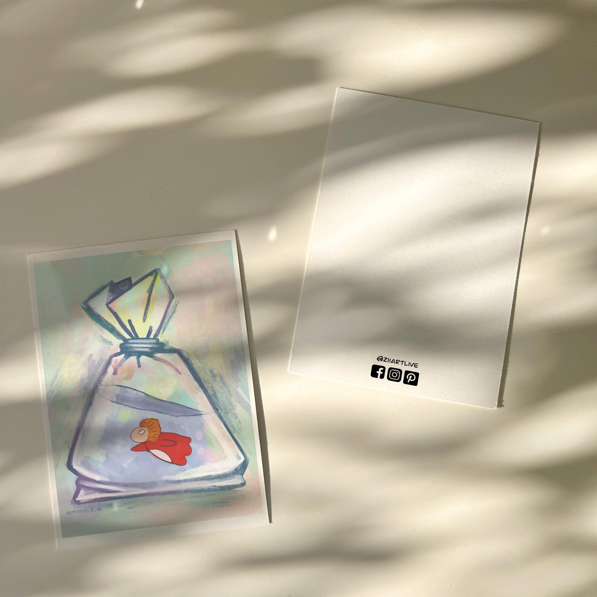Bring a touch of Studio Ghibli magic into your home with this beautifully whimsical Ponyo-inspired print! Featuring a dreamy, pastel-hued depiction of a little goldfish in a plastic bag, this artwork captures the enchanting spirit of adventure and wonder.